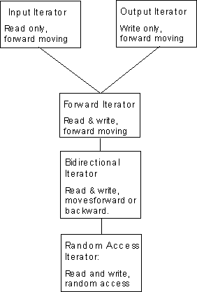 Iterators are a generalization of pointers that allow a C++ program to uniformly interact with different data structures. The illustration below displays the five iterator categories defined by the standard library, and shows their hierarchical relationship. Because standard library iterator categories are hierarchical, each category includes all the requirements of the categories above it.