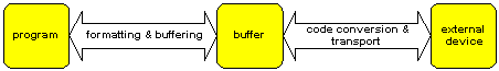 To reduce the number of accesses to the external device, a buffer is used. For output, the formatting layer sends sequences of characters to the transport layer, which stores them in a stream buffer. The actual transport to the external device happens only when the buffer is full. For input, the transport layer reads from the external device and fills the buffer. The formatting layer receives characters from the buffer. When the buffer is empty, the transport layer is responsible for refilling it.