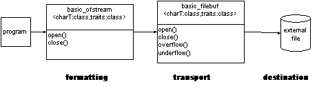 It does not have any knowledge about the external device. Instead, it defines two virtual functions, overflow() and underflow(), to perform the actual transport. These two functions have knowledge of the peculiarities of the external device they are connected to. They have to be overwritten by all concrete stream buffer classes, like file and string buffers.