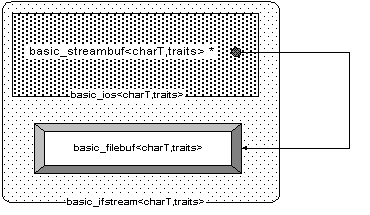 The base class basic_ios<> holds a pointer to a stream buffer. The derived stream classes, like file and string streams, contain a file or string buffer object. The stream buffer pointer of the base class refers to this embedded object. This architecture is illustrated in Figure 12 below: