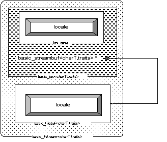 The class basic_ios<charT> holds a pointer to the stream buffer. This stream buffer has a locale object, too, usually a copy of the same locale object used by the functions of the stream classes. The stream buffer's input and output functions use the code conversion facet of the attached locale. Figure 13 below illustrates the architecture: